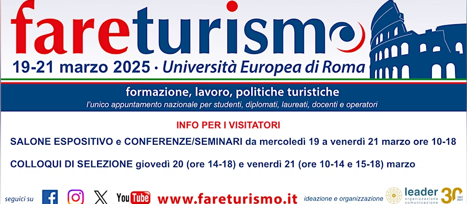 L’evento FareTurismo, alla sua 24ª edizione e organizzato dalla Leader srl, si terrà presso l’Università Europea di Roma dal 19 al 21 marzo 2025, dalle 10:00 alle 18:00. Questo evento biennale, della durata di 2 giorni e 8 ore, rappresenta un’importante opportunità per i giovani interessati a intraprendere una carriera nel settore turistico e per i professionisti del settore che desiderano aggiornarsi.