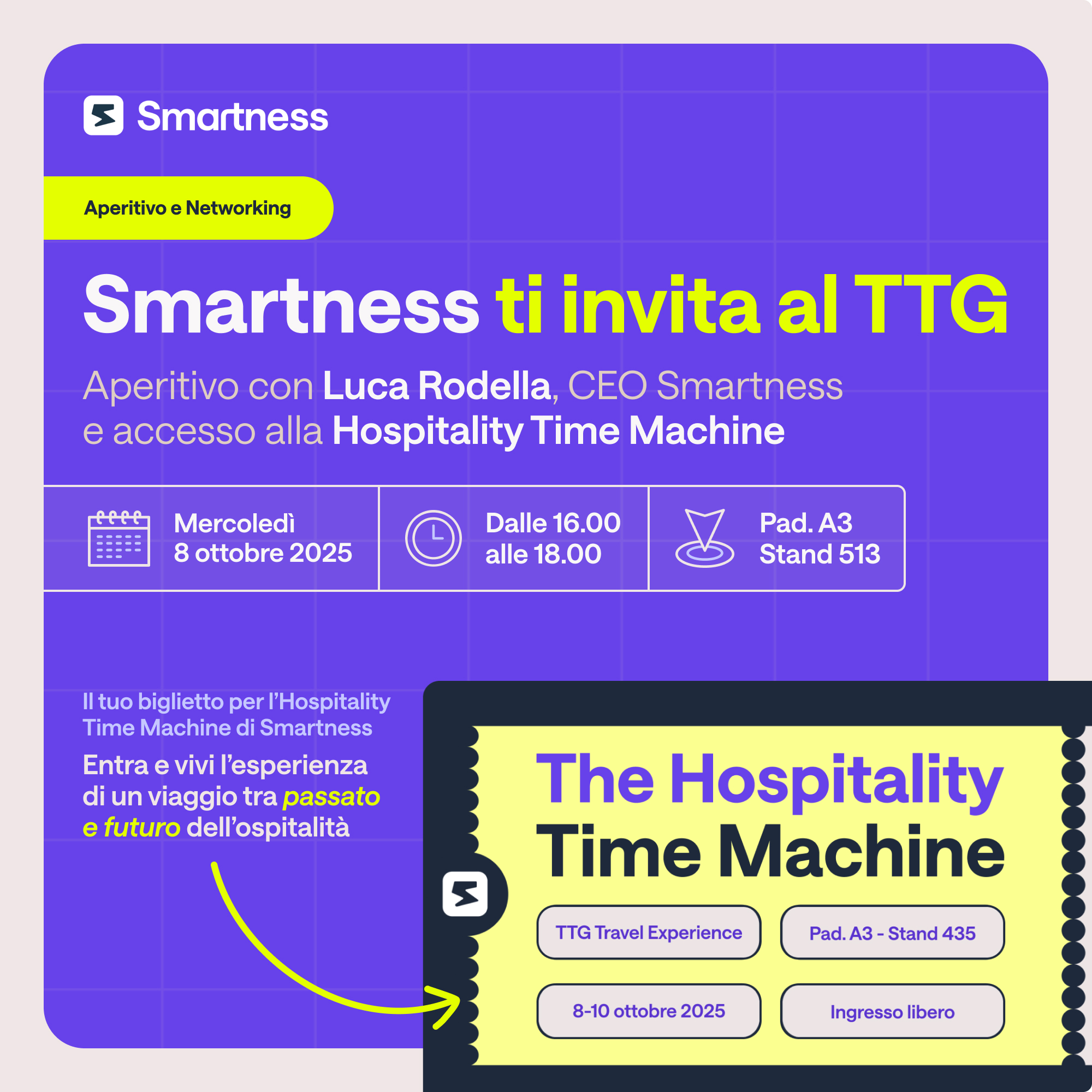 Dall’8 al 10 ottobre 2025 Smartness sarà tra i protagonisti del TTG Travel Experience di Rimini con la sua Hospitality Time Machine: uno stand concepito non come semplice spazio espositivo, ma come esperienza immersiva capace di riportare i visitatori indietro nel tempo e condurli verso il futuro dell’ospitalità.